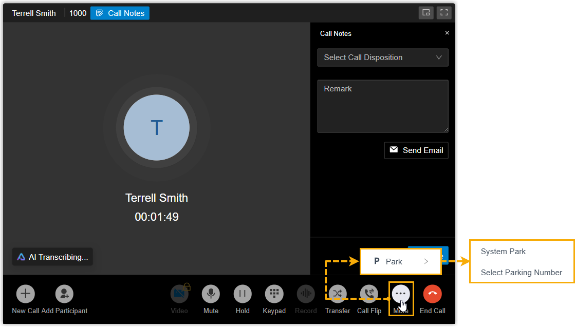 Added support for call parking via a dedicated button. By clicking the Park button on the call window, extension users can park an active call to a system-assigned or manually-selected parking number.