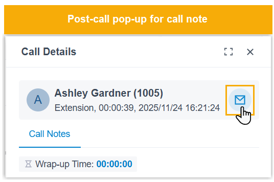 - Added an email template Call Follow-Up Template Via Email in the PBX system (Path: ). This template contains call information for a 1:1 call and is used when extension users click to send call details via email during a call or after calls.
