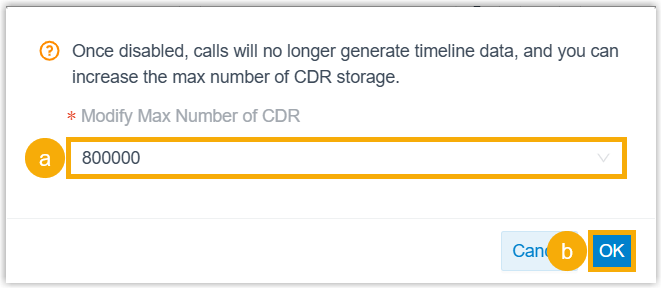 - If you want to increase the CDR storage limit, keep the recommended value or select a value from the drop-down list of Modify Max Number of CDR.