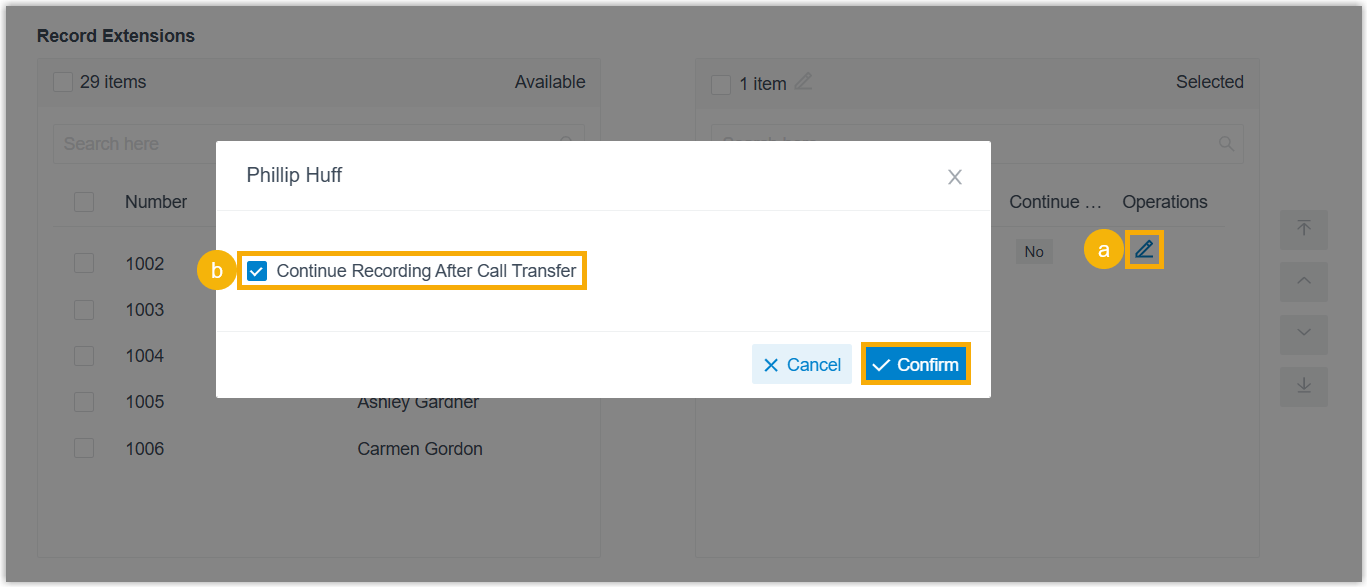 beside a selected extension. - In the pop-up window, select the checkbox of Continue Recording After Call Transfer, then click Confirm.
