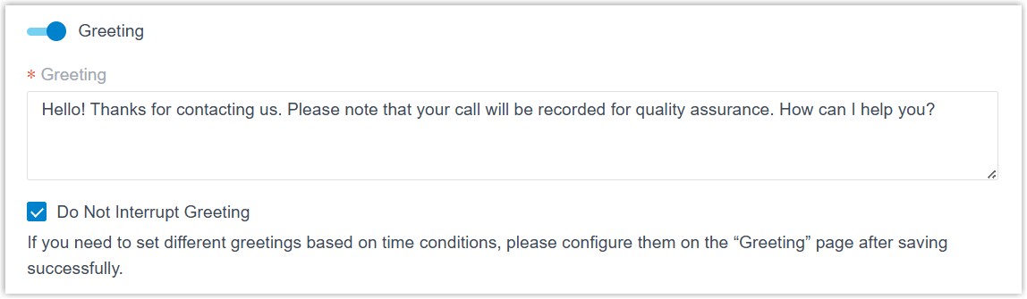 - If you need to set different greetings based on time conditions, you can configure them later after the AI receptionist is created. For more information, see Configure Time-Based Greetings.