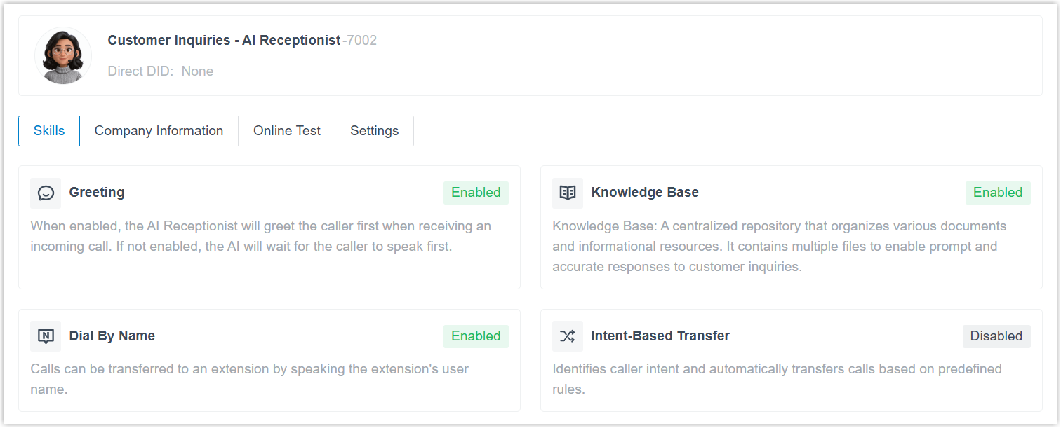 - Complete the following configurations to set up an AI receptionist.