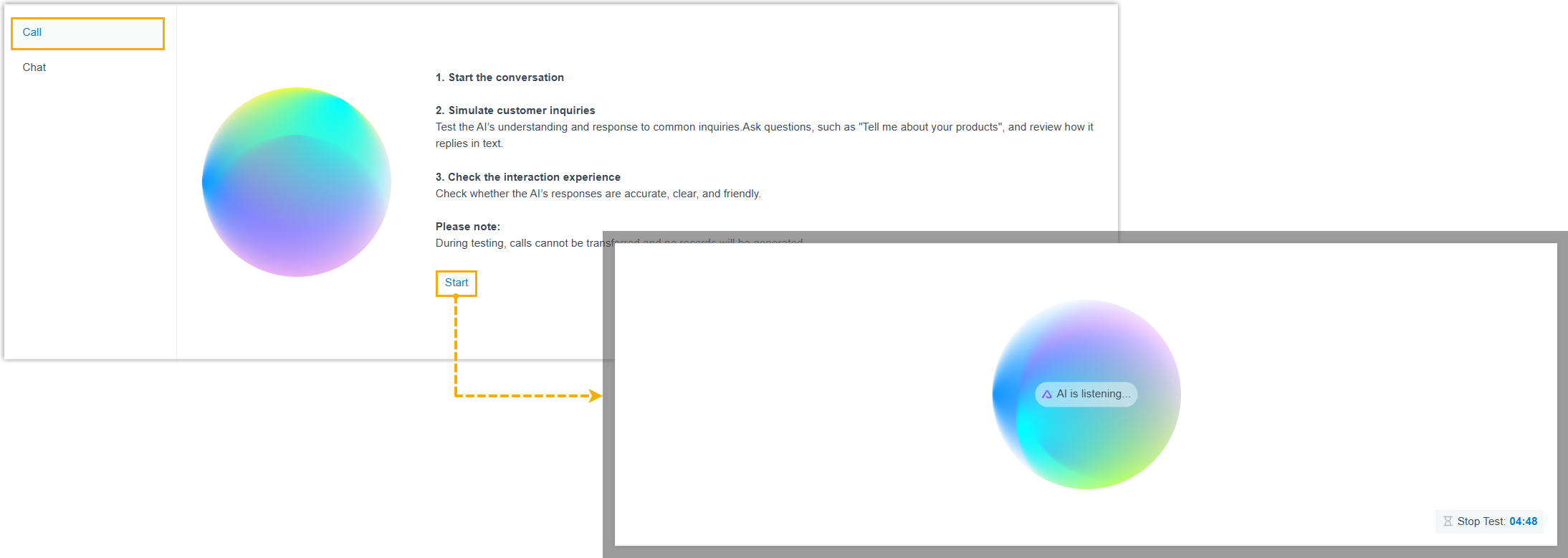 - Click Start to initiate a test call.
