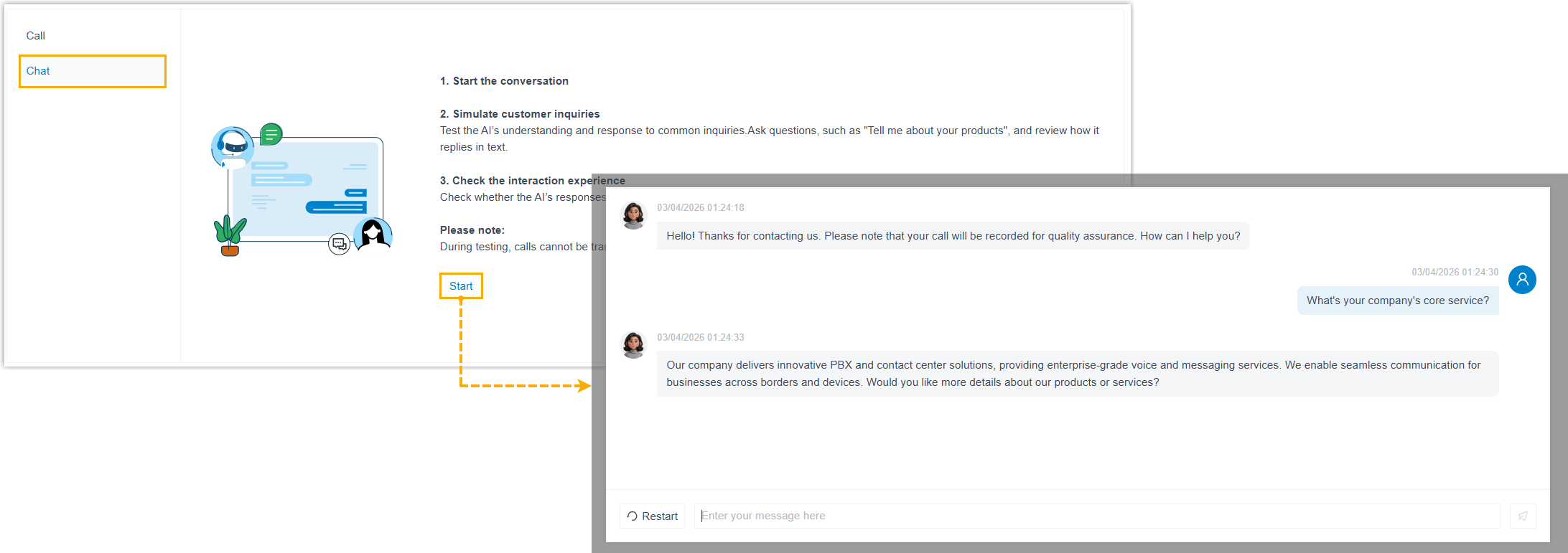 This topic describes how to test an AI receptionist to verify its responses, either via call or chat.