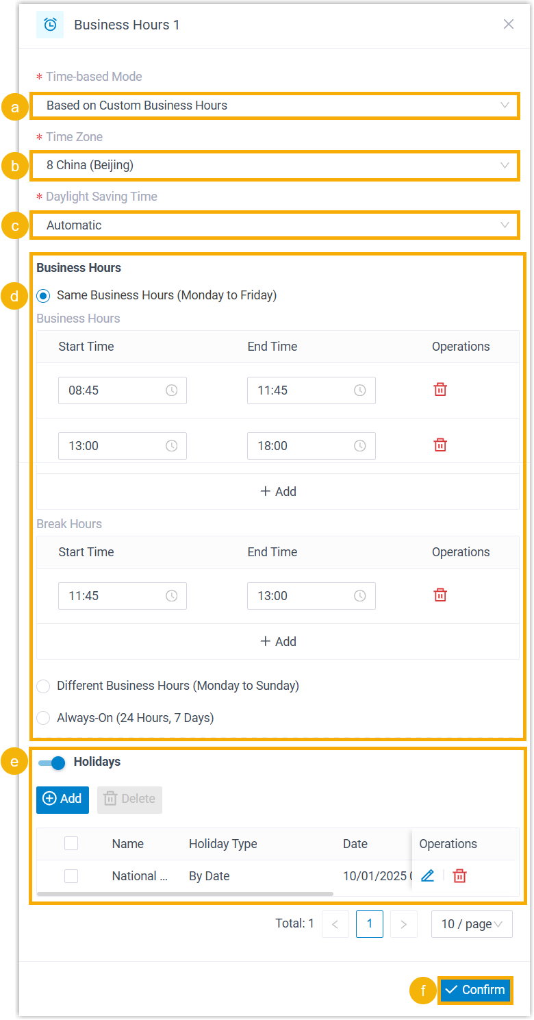 related settings to customize business hours.Note: Up to 10 time periods are supported for business hours and break hours respectively.
