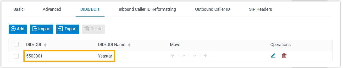 DID Optional. Select one or more trunk DID number(s) from the drop-down list. Note:- Up to 500 DID numbers are supported. Note that the more DID numbers assigned, the longer it takes to match inbound call with the call flow.