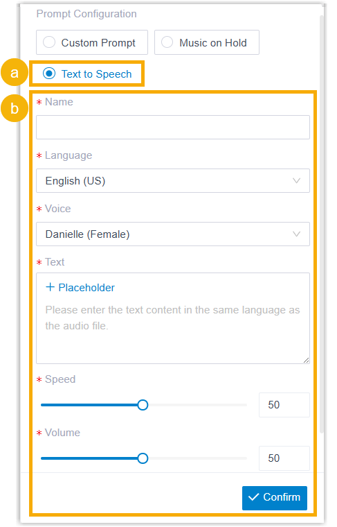 - Configure audio prompt(s) or a text-to-speech message to