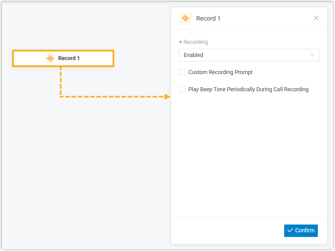 Record component allows you to start recording a call upon the caller being connected to another participant, and optionally configure prompts to inform call participants at the start and during the recording.