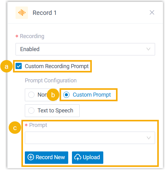 Prompt Type Description Custom Prompt Choose from existing custom prompts, or create a new one by recording with an extension or uploading an audio file. Text to Speech (TTS) Enter the desired text, which will be converted to speech in the selected language and voice style.