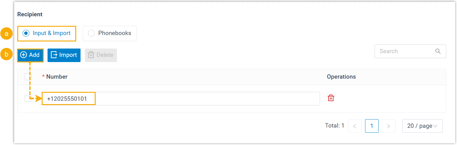Method Instruction Manual entry Manually add contact numbers in E.164 format (e.g.,