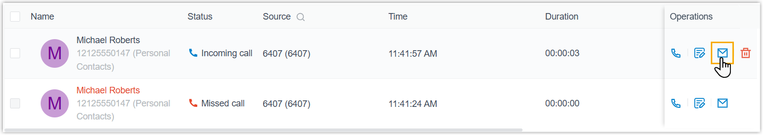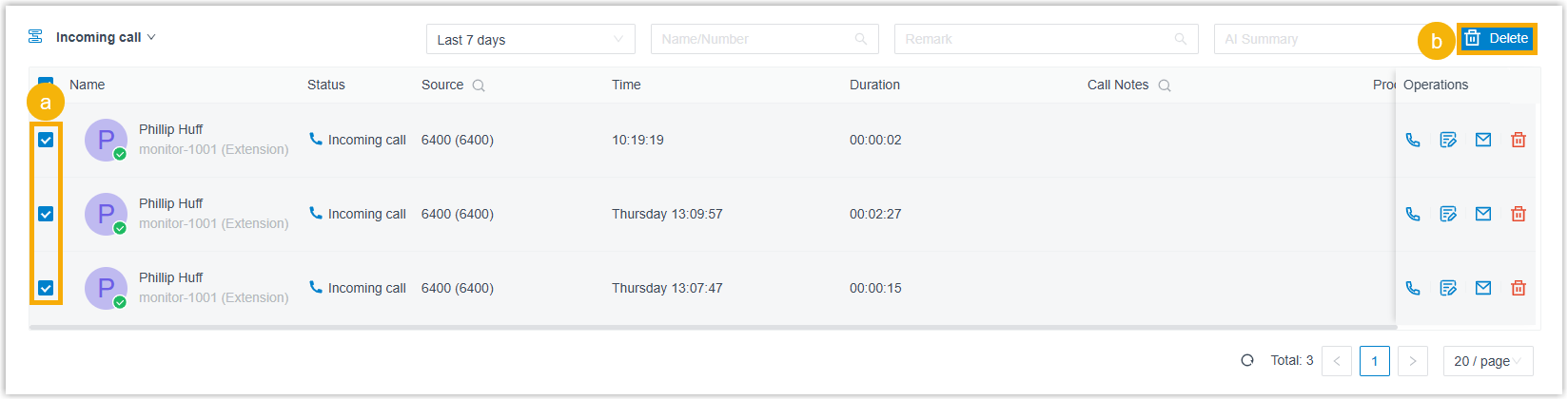 Delete incoming queue call logs Note: Only supports to delete the call logs of queue calls that you have answered.You can delete incoming queue call logs via the following methods:- To delete a single call log, click