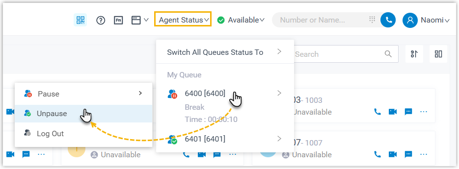 Unpause service in a specific queue using feature code - Obtain the Pause/Unpause feature code from the system administrator.