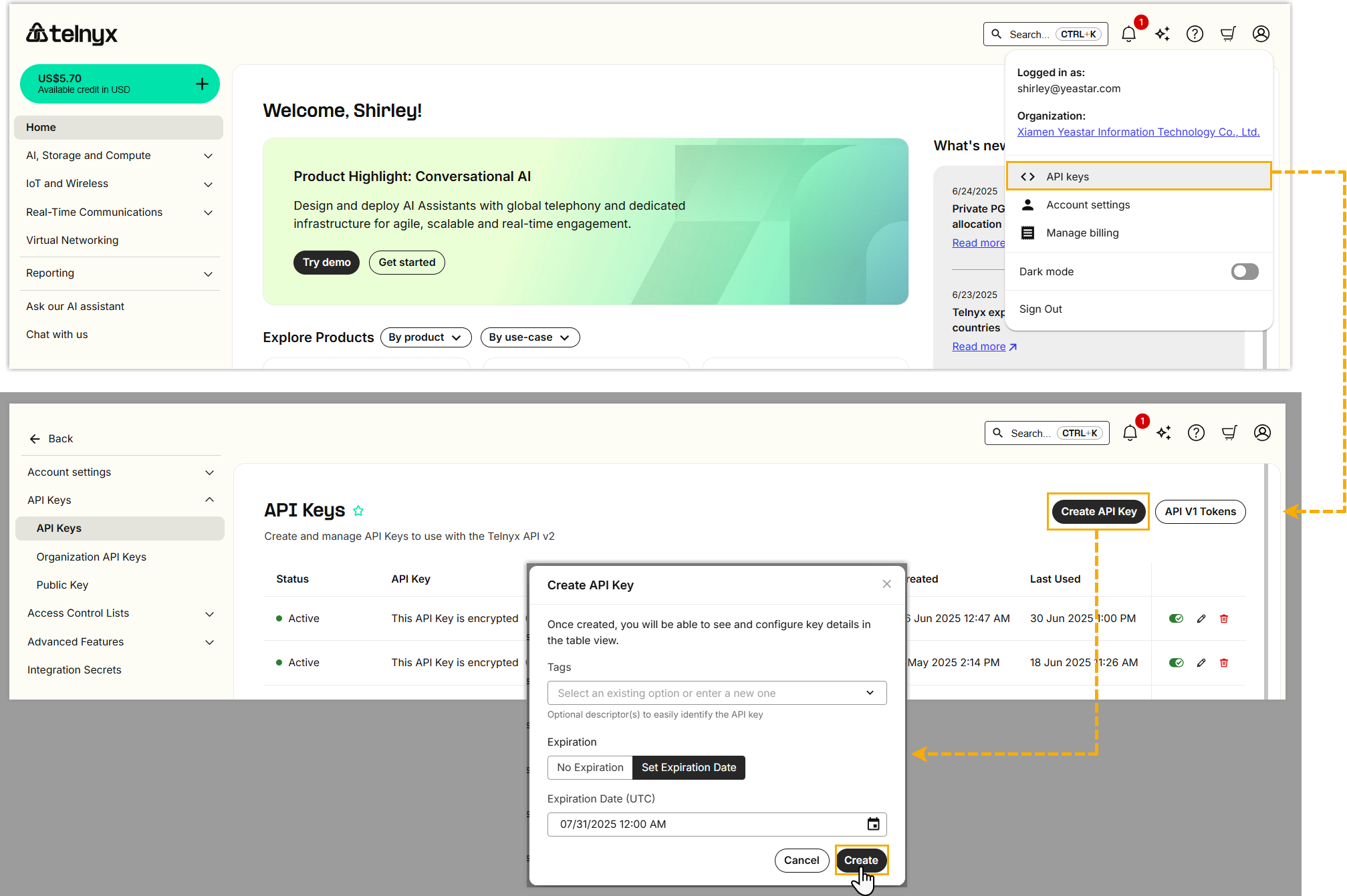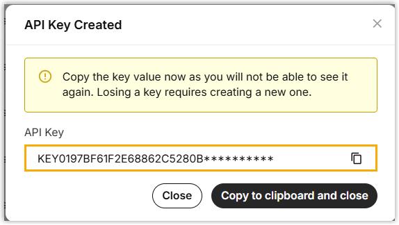 - Create an API key for the integration with PBX.Important: Properly copy and save the API key after it is created, as it will only be displayed once. You will not be able to view the key again after you close the API key display window.