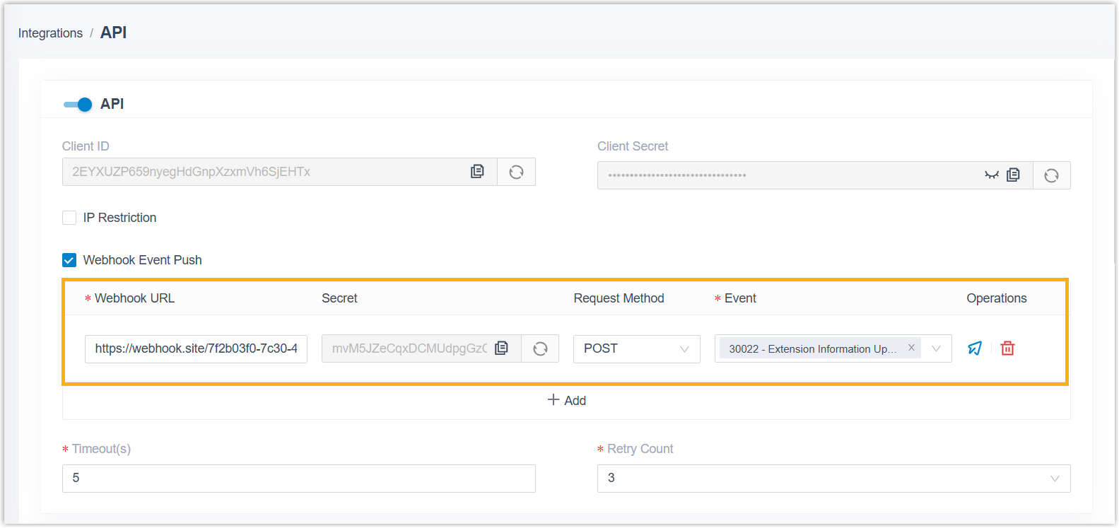 2xx) within the specified time, the PBX will resend the request based on the Retry Count setting. - In the Retry Count drop-down list, select how many times the PBX should resend the request if delivery fails or no successful response is received.