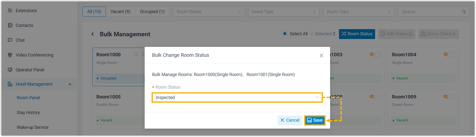 Yeastar P-Series Cloud Edition supports two ways to change the status of guest rooms: