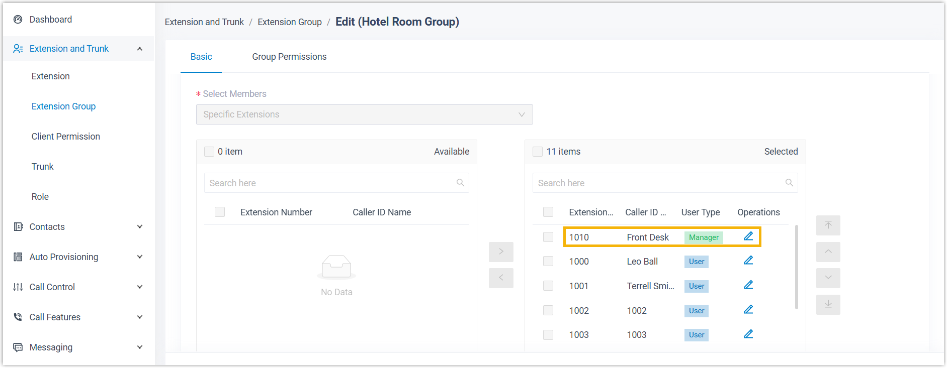 Yeastar P-Series Cloud Edition implements group-based control over users' call management permissions. After you enable hotel management on PBX, an extension group Hotel Room Group is automatically created, and all extensions assigned to guest rooms will be added to the group.