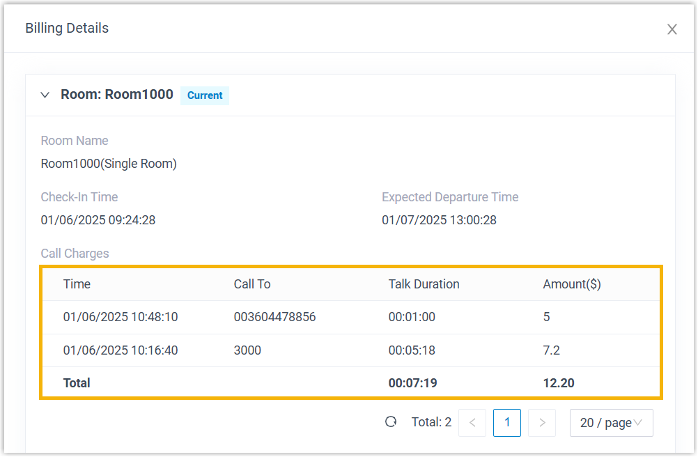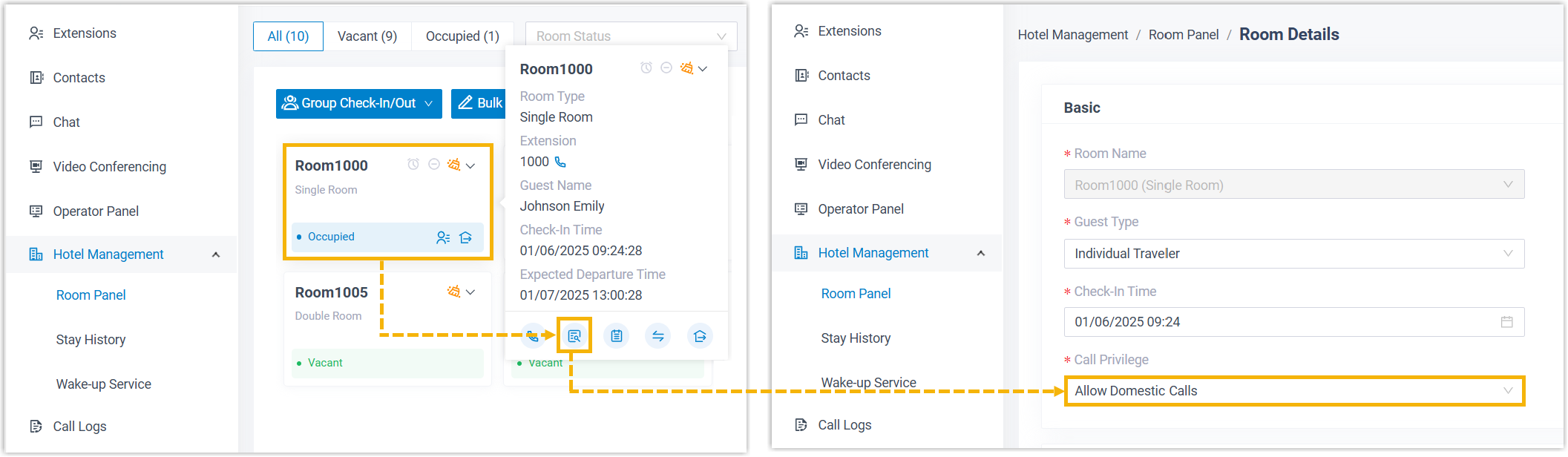 - Click Save. Note: If guest(s) request domestic outbound calling permission after check-in, you can grant the permission from room page, as shown below.