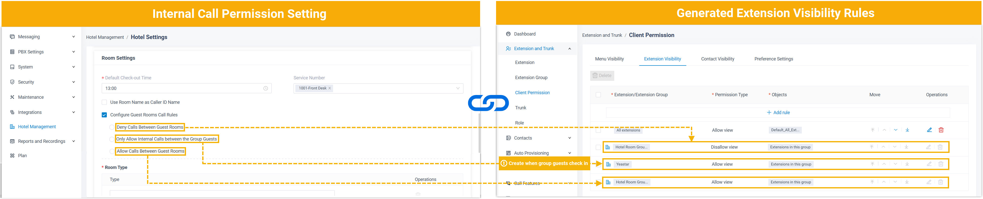 For Yeastar PBX, internal call permission is associated with extension visibility rules. To put it simply, guests can make calls between rooms only if their room extensions are allowed to view the called extension. By default, there are no rules to allow room-to-room calls.