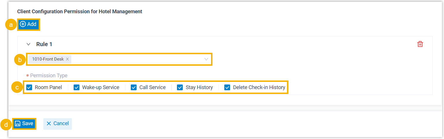 - In the Client Configuration Permission for Hotel Management section, click Add.