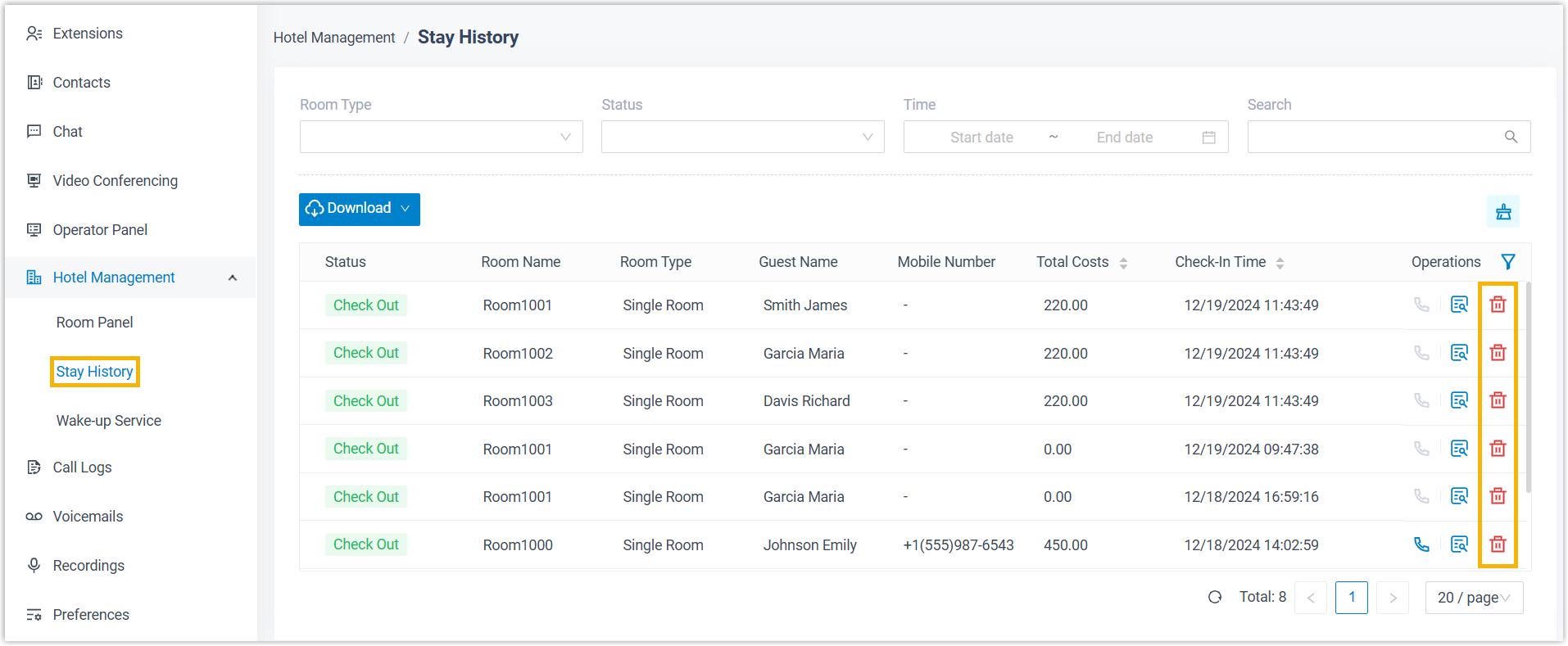 Delete Check-in History The authorized staff member can access Stay History on Linkus Desktop/Web Client (Path: ) to delete guest stay history.