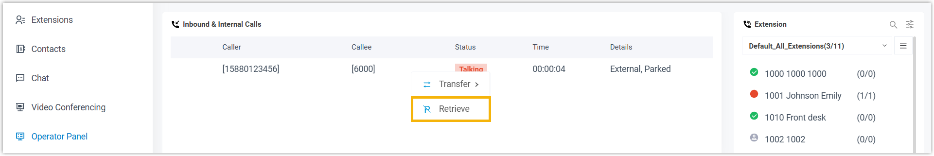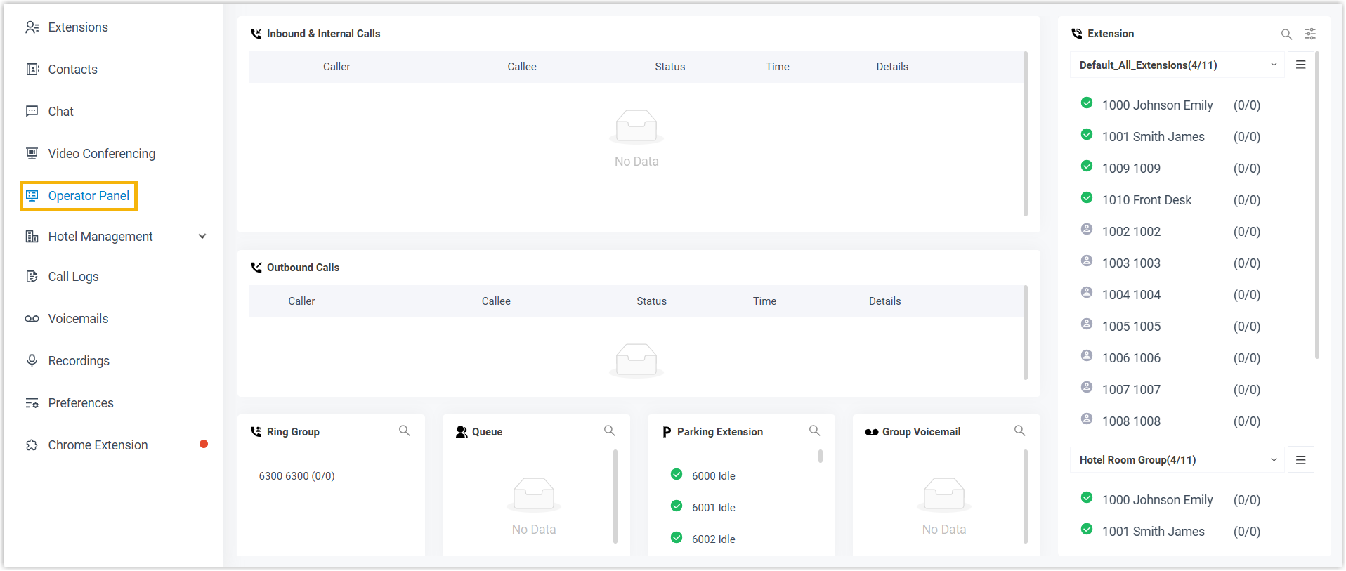 In some cases, front desk may need to manage guest calls, such as transferring calls to another room. This topic describes how front desk can manage guests calls from Operator Panel.