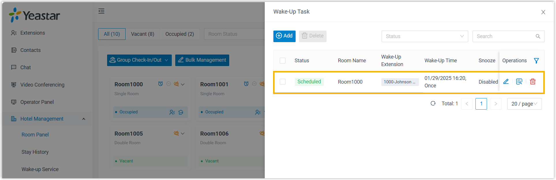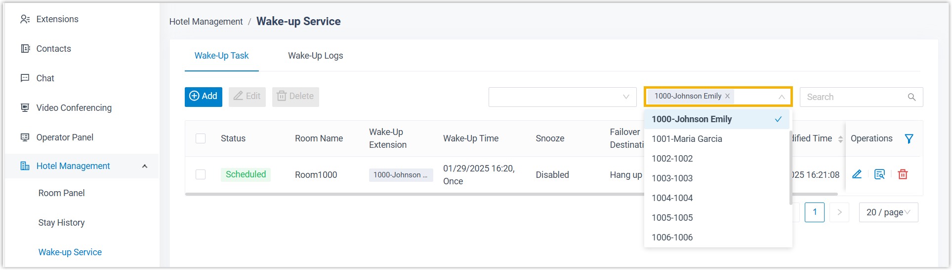 In case of need, front desk can query the scheduled wake-up calls for guests on Linkus Desktop/Web Client. Alternatively, guests can query their own scheduled wake-up calls from their room phones.