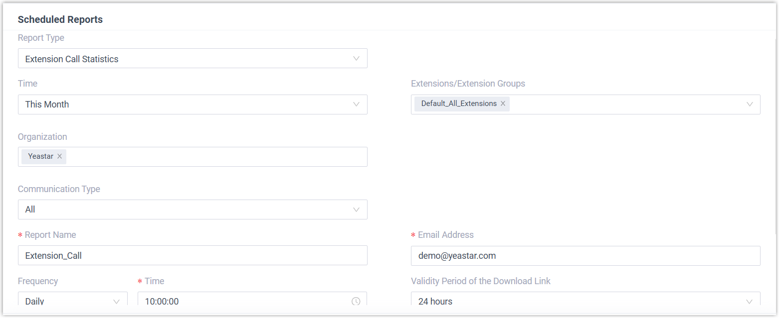 Setting Description Report Type Select a call report. Time Select a time frame that the report will cover. Extensions/Extension Groups Select one or more objects of call data you want to query. Report Name Enter a name to help you identify the report. Email Address Enter email address(es) to receive the report. Note: You can specify up to 10 email addresses. For multiple email addresses, separate them with semicolon;.Frequency Set how often to send the report. Validity Period of the Download Link Set the validity period of the download link for the scheduled report. After the link expires, the email recipient(s) can NOT download the report via the link.