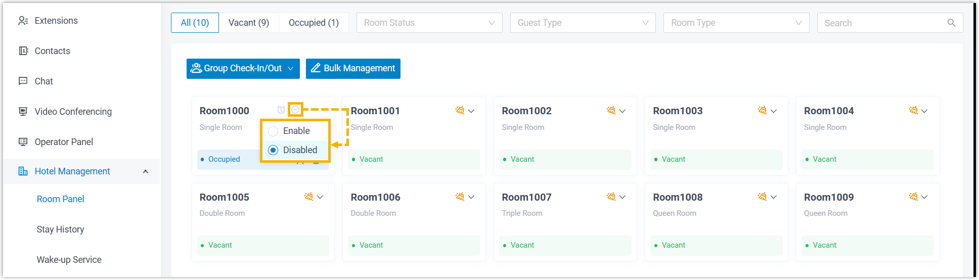 Front desk can enable DND for room phones when guests do not want to be disturbed, and disable DND when guests are ready to answer calls.