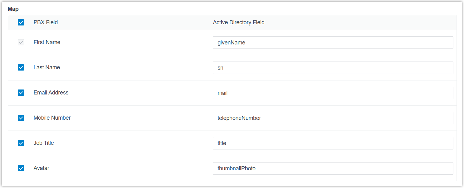 - If mapping is disabled for a specific field, that field will not be synchronized from Active Directory. You can then edit the corresponding extension information directly on the PBX.