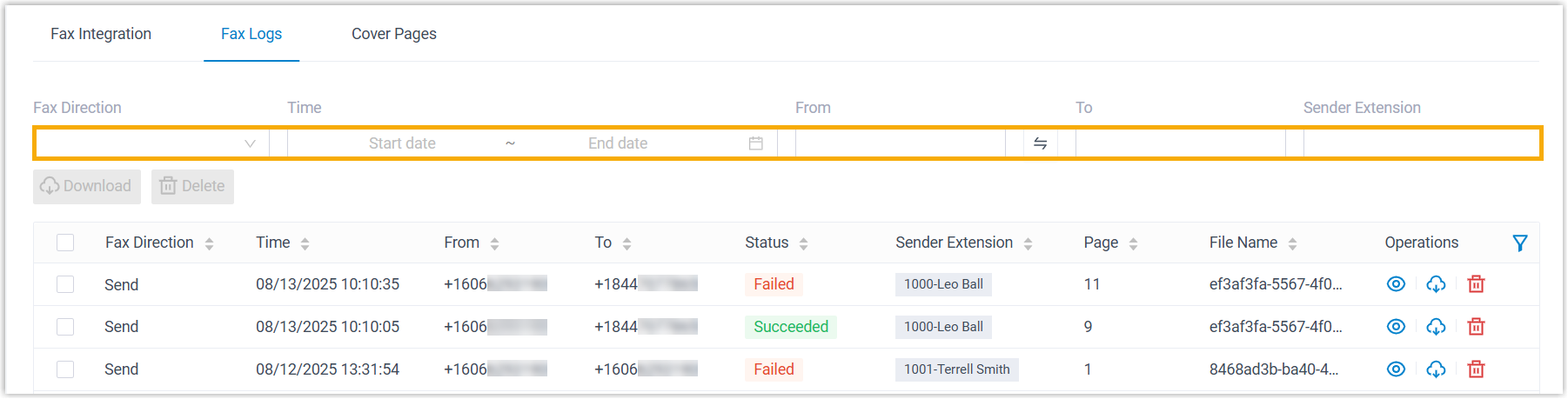 Item Description Fax Direction Select Send or Receive to filter sent or received faxes. Time Specify a time range to filter faxes sent or received within the period. From Enter the sender's fax number in E.164 format. To Enter the recipient's fax number in E.164 format. Note: For scheduled outbound faxes with multiple recipients, only the first number displayed in the list will be searched.Sender Extension Enter extension number or extension name to filter faxes sent by a specific user.