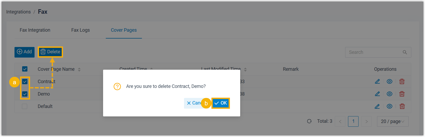 The following instructions describe how administrator can delete fax cover page(s) from PBX web portal. For more information about how extension users can proceed from their Linkus clients, see Delete Fax Cover Pages from Linkus Desktop Client and Delete Fax Cover Pages from Linkus Web Client.