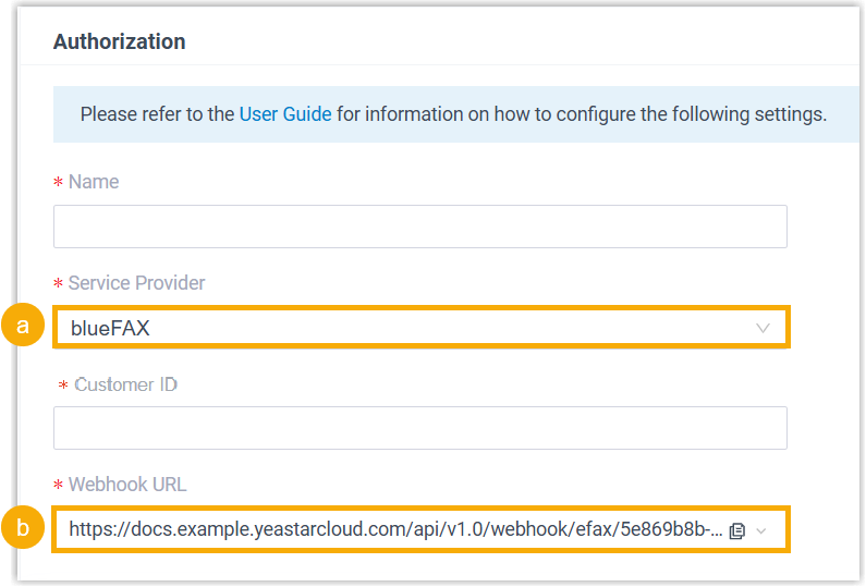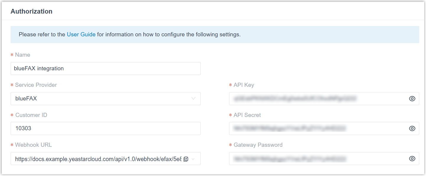 - Obtain the Webhook URL for blueFAX.Important: The URL will change once you leave the current page. Please remain on this page until you have configured the Webhook URL and obtained credentials from blueFAX to complete the integration setup on this page.