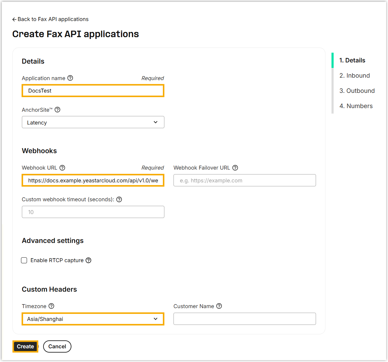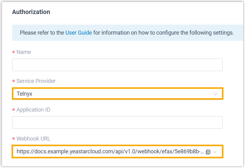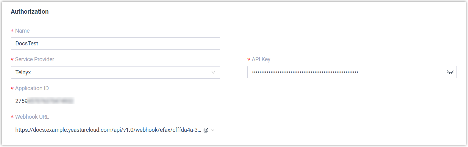Obtain a Webhook URL from Yeastar PBX first, which is required when you set up a fax application on Telnyx.