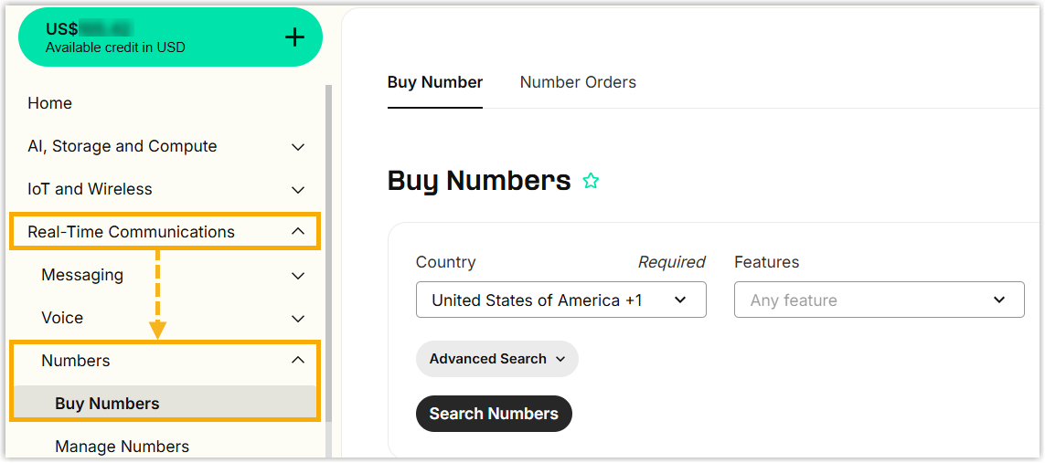 You will be redirected to the Manage Numbers page, where the purchased number is displayed.