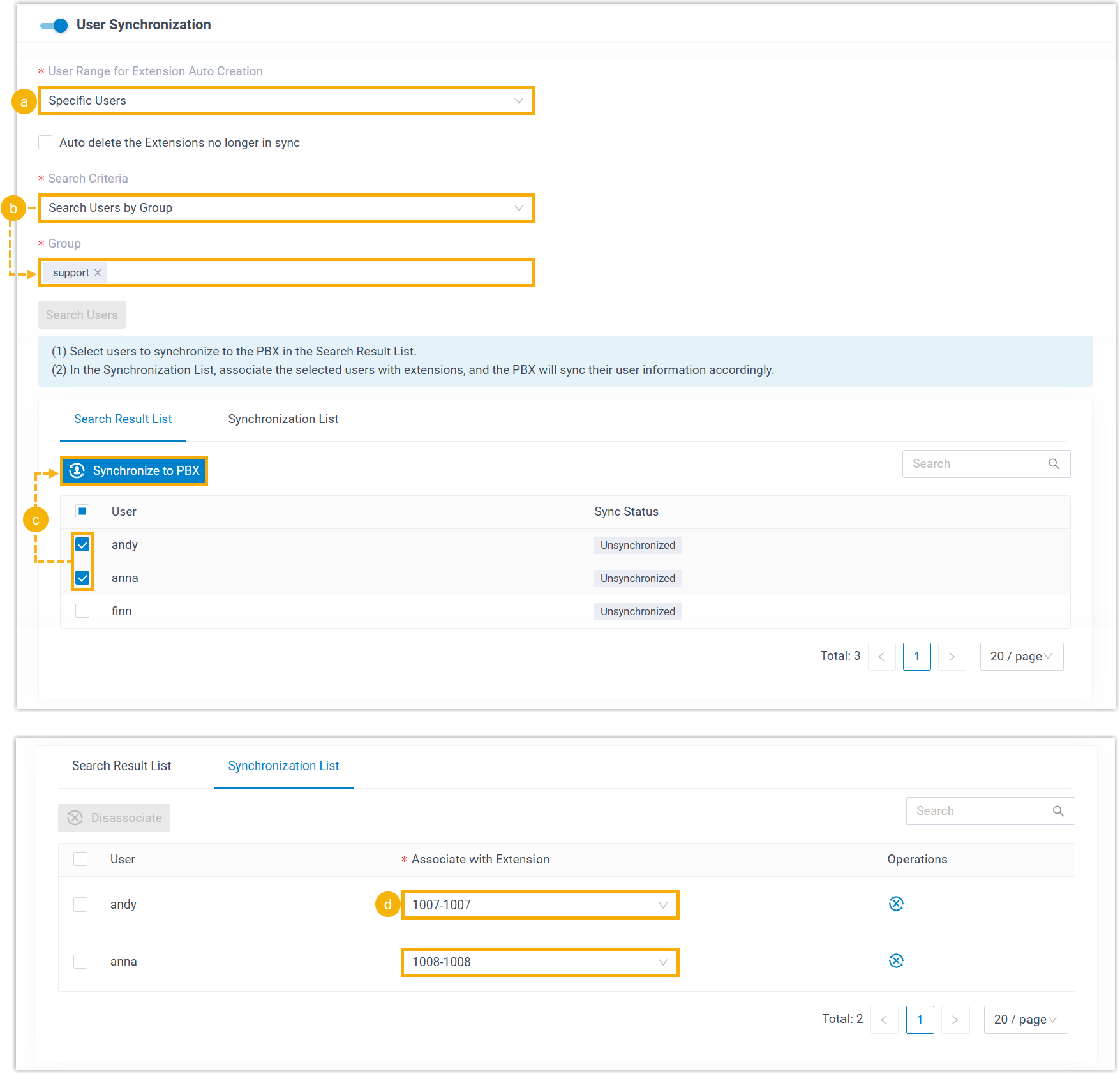 - Set the system to synchronize specific users and manually assign extensions