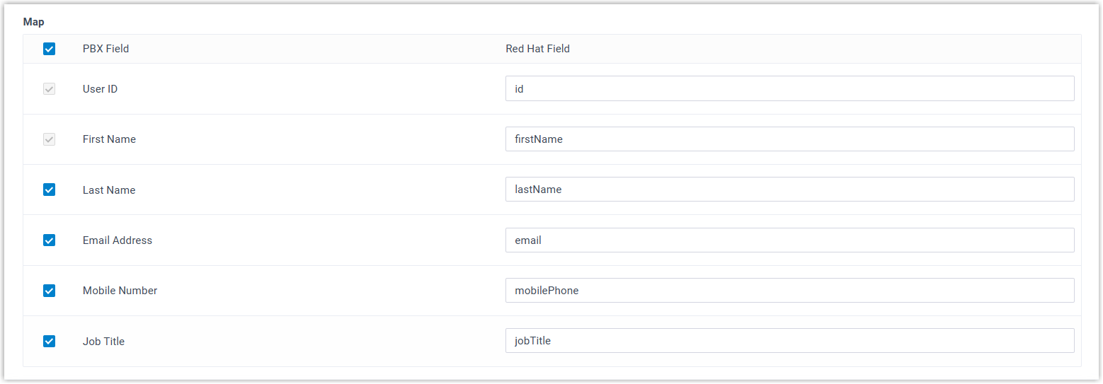 Note: The First Name, Last Name, Email Address, Mobile Number, and Job Title of these extensions are synchronized from Red Hat. Therefore, they can only be updated in Red Hat, and the changes will be reflected to the PBX during a synchronization.