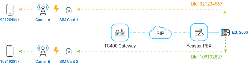 On Yeastar TG400 gateway, create an 'IP to Mobile' route for carrier A, and create another one for carrier B. These two routes will match the dialed numbers from PBX, and send numbers out through designated 4G trunks.