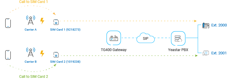 On Yeastar TG400 gateway, create an 'Mobile to IP' route for carrier A, and create another one for carrier B, so as to route incoming calls to Yeastar PBX system.