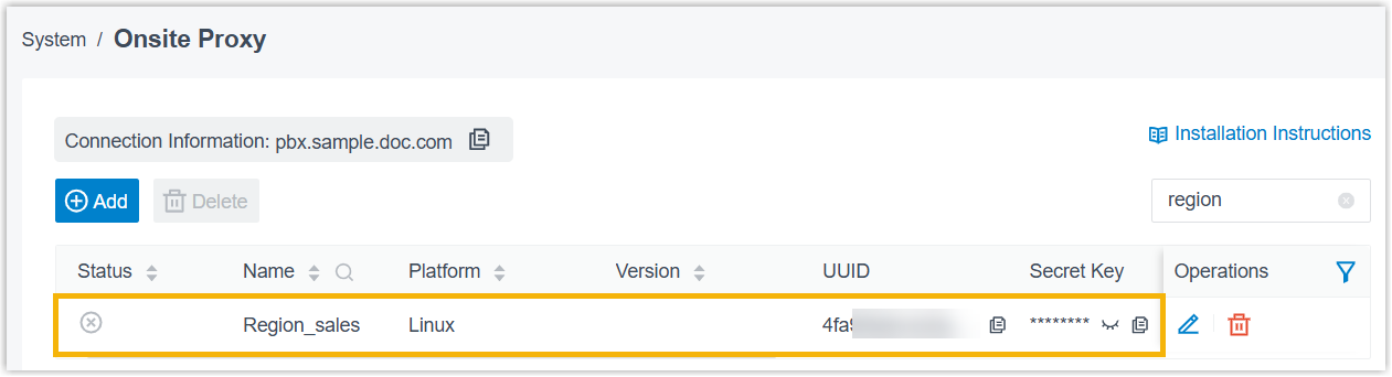Before connecting a remote Onsite Proxy to Yeastar P-Series Cloud Edition, you need to first add an Onsite Proxy instance on the PBX to obtain the connection information for later configuration. This topic describes how to add an Onsite Proxy instance on the PBX.