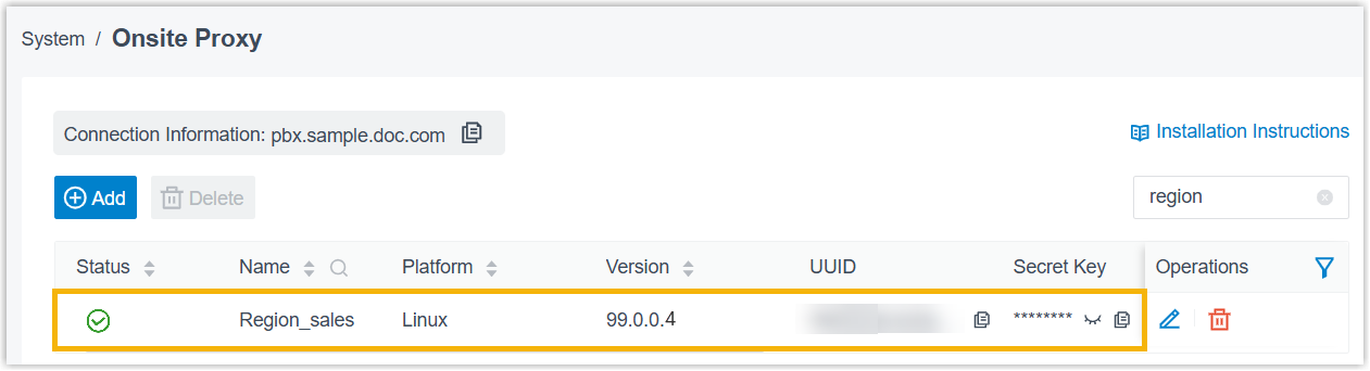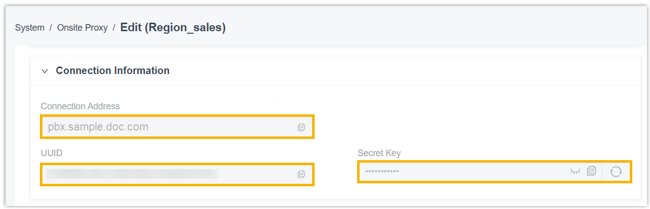 You have added an Onsite Proxy instance on Yeastar PBX and obtained the connection credentials (connection address, UUID, secret key) (Path: ).Note: To avoid the Secret Key being used, it is recommended refresh it and copy the new one.