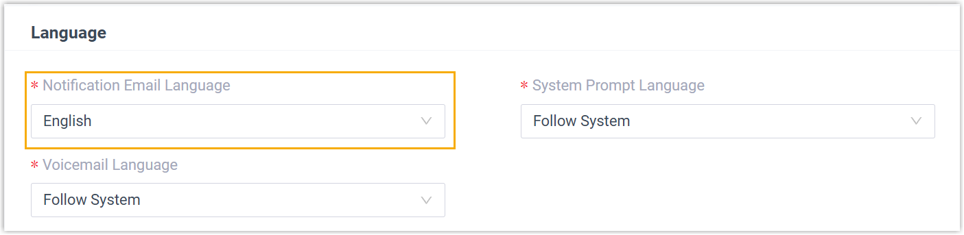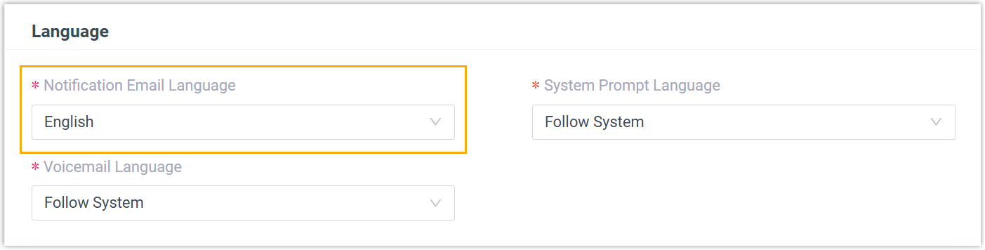 - Optimized the voicemail language settings of extensions: The entry of the feature settings has been moved from to , allowing for customizing the prompt language that callers will hear when accessing the extension's voicemail.