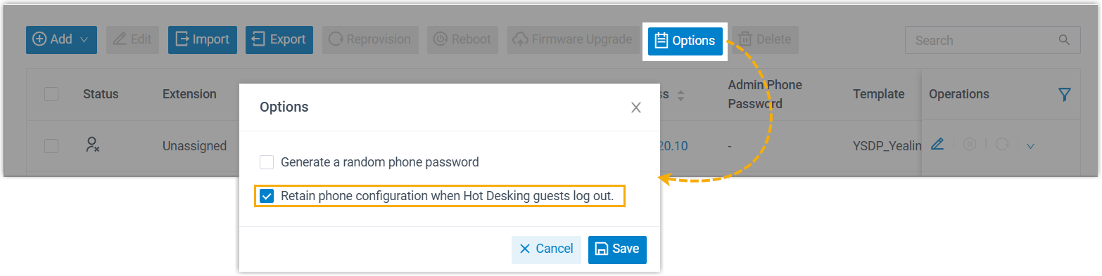 log out of a Hot Desking phone.Note: To achieve this, you need to enable the option Retain phone configuration when Hot Desking guests log out (Path: ).