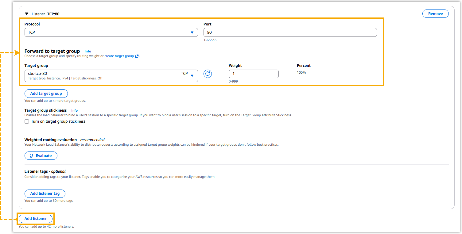 - Port: Enter the port number defined for that target group. For example, enter 80.