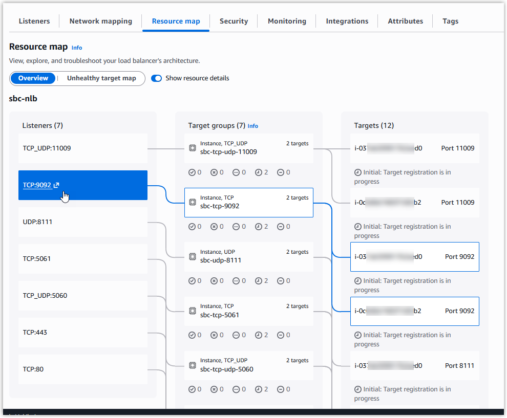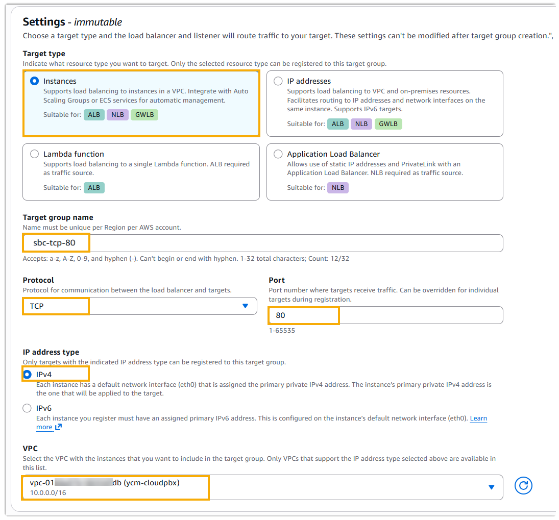 - Target group name: Enter a name to help you identify the target group. For example, sbc-tcp-80.