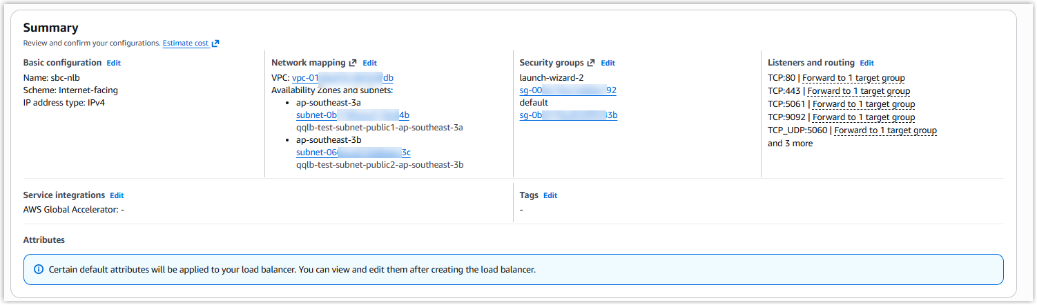 - Load balancer name: Enter a name for the load balancer to help you identify it. For example, sbc-nlb.