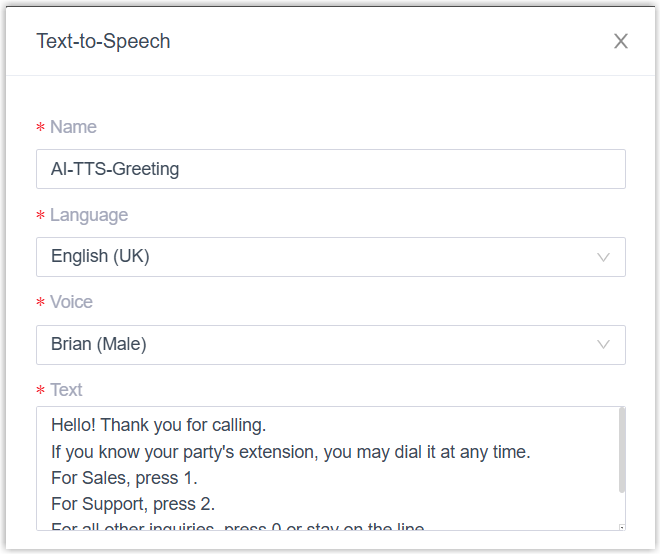 The AI-powered Text-to-Speech (TTS) supports converting text into lifelike speech. With TTS, you can generate greetings simply by entering text, eliminating the need to record or upload audio files manually. This topic describes how to generate greetings with AI TTS on Linkus Desktop Client.