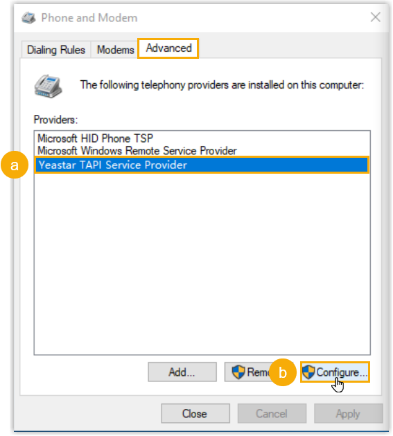 Under the Advanced tab, if you see the Yeastar TAPI Service Provider displayed in the Providers list, it indicates that the Yeastar TAPI driver is installed successfully.