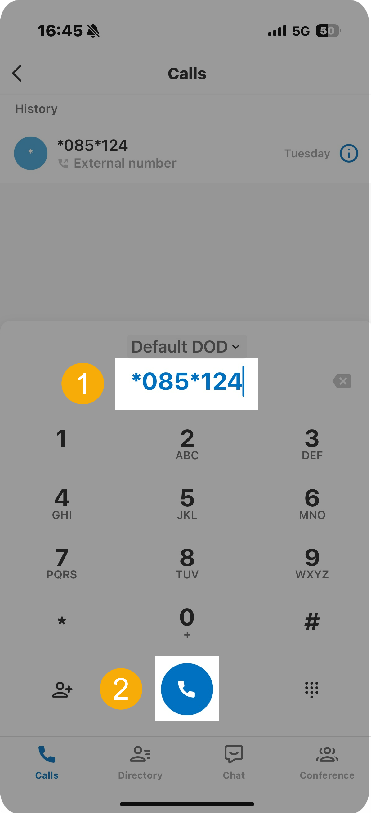 Note: To use this method, you need to obtain a DOD prefix feature code and the short code of the specific DOD number from your system administrator.- In the Dialpad, enter the feature code