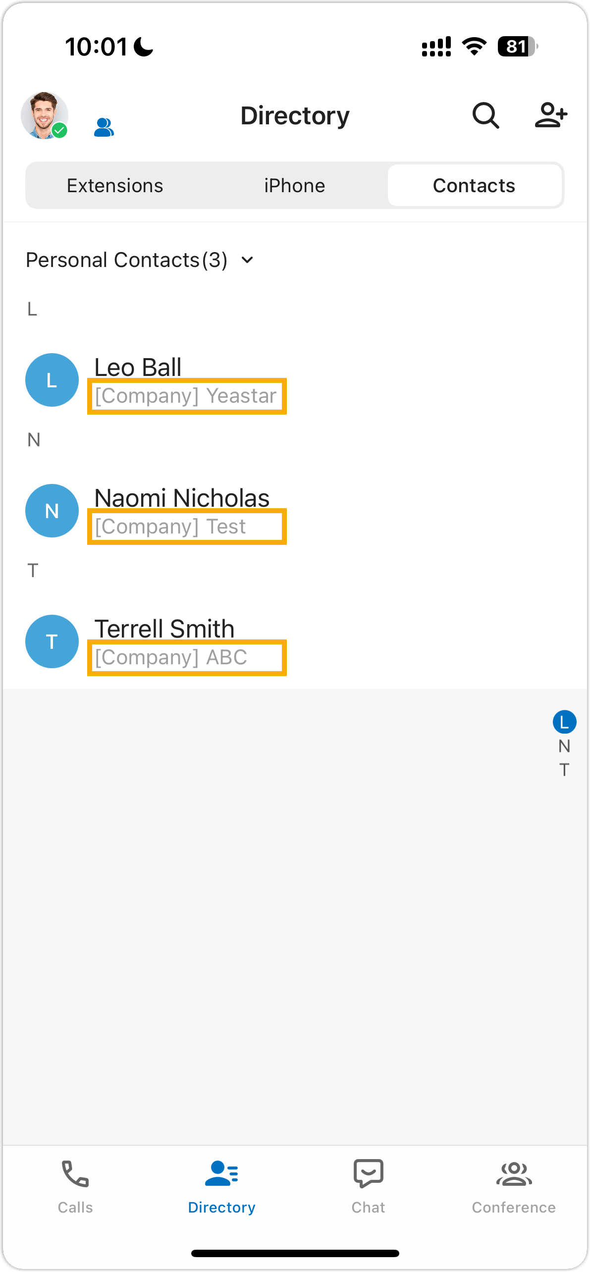 - Company Contacts: Users can add external contacts such as company's customers, resellers, and partners to company-shared Company Contacts.