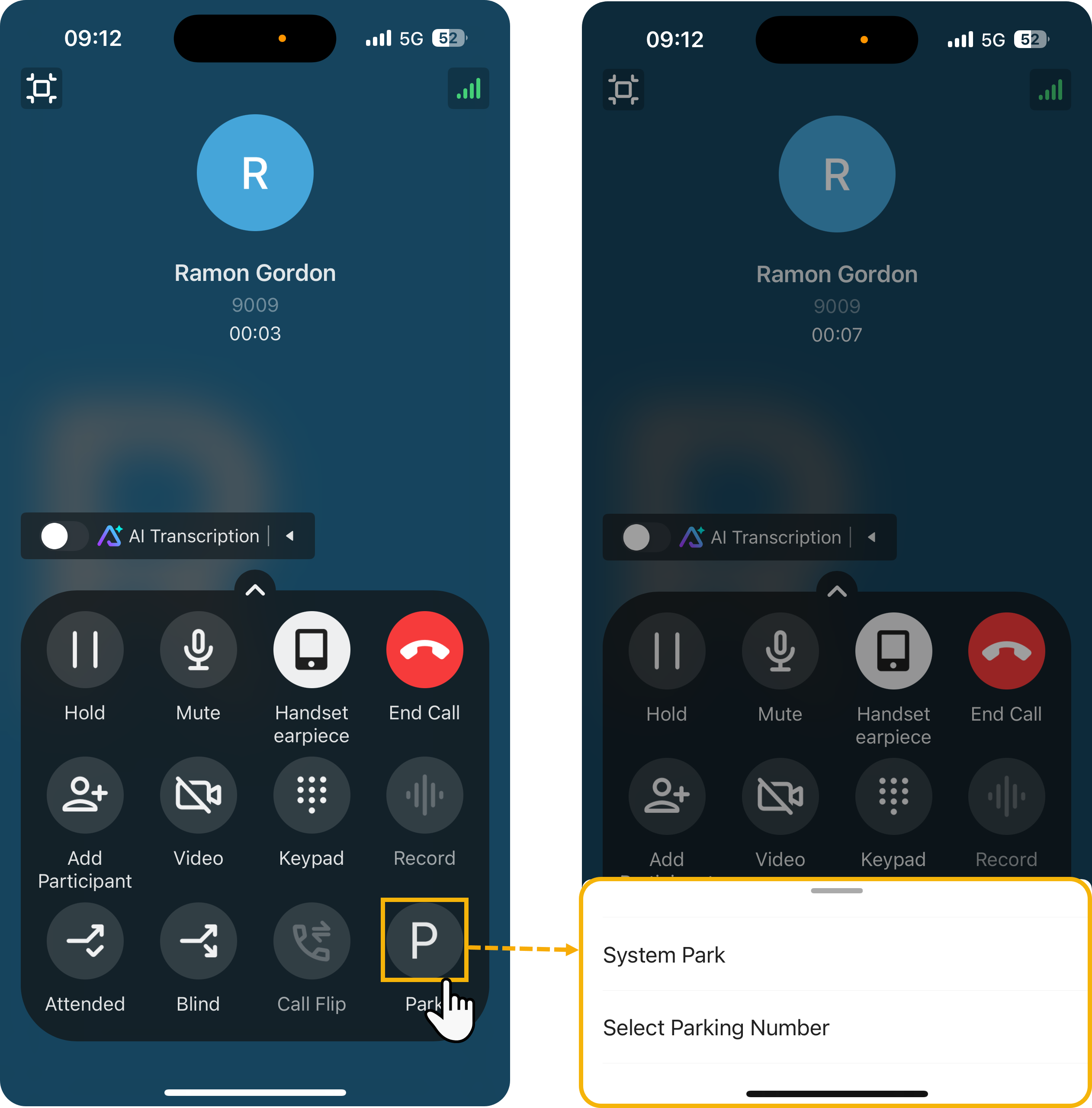 button.During an active call, you can tap the Park button from the call screen to park the call on a system-assigned or manually selected parking number.Note: To achieve the new feature, system administrator needs to upgrade PBX to version 37.21.0.66 or later.
